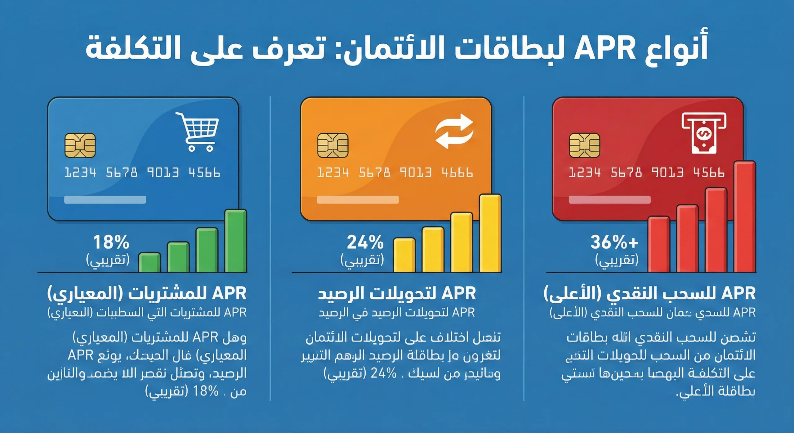 - بطاقات الائتمان: يُستخدم الـ APR للمقارنة بين بطاقات الائتمان المختلفة ومعرفة تكلفة الفوائد في حالة عدم سداد المبلغ كاملًا.