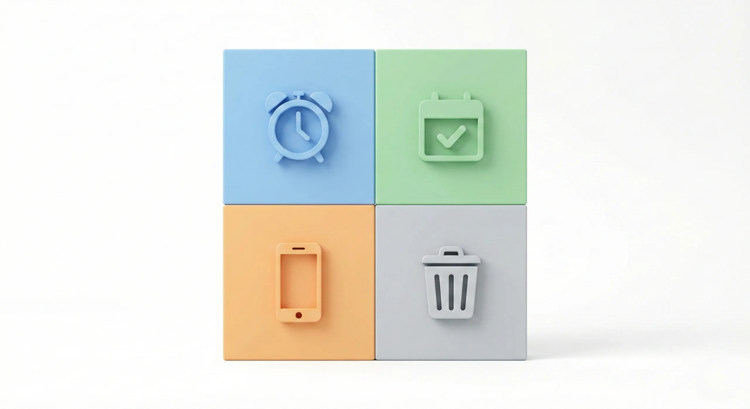 | غير هام وغير عاجل (M4) | مضيعات الوقت والأنشطة الترفيهية المفرطة. | احذفها (Delete) هذه هي “منطقة الهدر”. |
